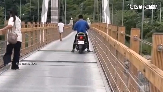住戶說:「準備跟在這台貨車後面看一下這個橋。」工程吊車不斷向前行駛,後方騎士拍下過程,住戶說:「這是唯一,一條部落進出的道路。」眼看貨車行經吊橋時,不僅車身大幅上下晃動,仔細一看,地面上鐵板,還被輪胎壓的像是要解體般,發出刺耳聲響。