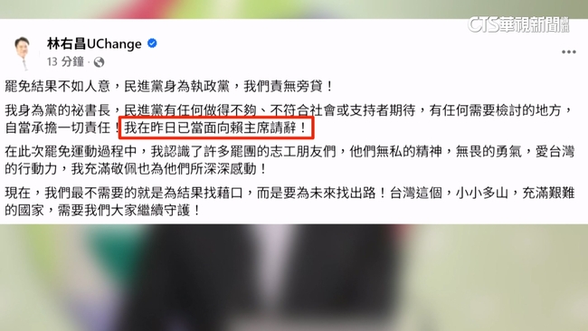 首波罷免案24+1席宣告全軍覆沒,民進黨秘書長林右昌臉書發文,自己已經在昨(27)日向黨主席賴清德請辭。更有週刊爆料,8月底預計進行內閣改組,立委吳思瑤則表示,尊重行政部門決策。