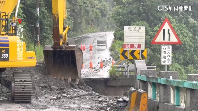 雨下不停,荖濃溪大暴漲,沖毀了寶來二橋,桃源區成孤島,不只桃源區,還有那瑪夏,楠梓仙溪溪水漫過民生橋,主要聯外道路台29線,也有多處坍方,兩個區對外道路都被阻斷,將近7千人受困,公路局甲仙段工務人員,冒雨趕著搶通,讓主要道路可恢復單線通行,物資與需就醫居民能夠出入。