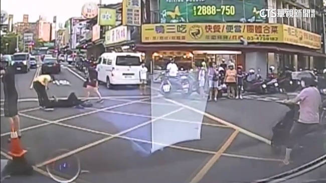 車水馬龍的車道上,一輛機車騎士直行往前騎,突然有女童從左方跑出來,下一秒機車騎士反應不及迎面撞上,撞擊後2人雙雙落地,而車禍撞擊聲也嚇壞附近民眾,趕快跑過來查看。事故發生後,民眾站在道路中央舉起雙手揮呀揮,幫忙指揮現場交通,同時拿出交通錐避免其他車輛追撞。