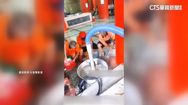 坐在板凳上的阿伯們,拿著「笨斗」猴呀猴,努力將地面上的積水,「猴起來」,不斷舀進桶中,而這地點就在這家廟宇內,究竟當時發生什麼狀況。原來就在昨(4)日,滂沱大雨轟炸,嘉義縣溪口鄉柴林村,也讓這家廟宇,窗戶抵擋不住強勁雨勢,造成廟宇倉庫內,滿室積水,不過積水並不多,廟方才會以人力方式,將水集中後,再用抽水機抽到戶外。