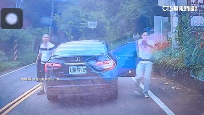 一輛車開在山路上,前方黑色轎車突然停下來,左側還有輛警車跨越雙黃線跟著停下,下一秒車內的人都下車,把駕駛全家團團包圍。開車門後不到3秒鐘,員警拿著甩棍衝下車,前方黑色轎車上的白衣男子,更持槍下車邊跑邊瞄準擋風玻璃。