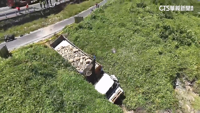 砂石車衝破空拍,一輛砂石車因為巨大撞擊力道,衝破護欄飛越小徑,傾斜卡在外海岸邊礁石處,前方就是大海相當驚險,轎車撞,銀白色轎車,車頭卡在護欄底下,板金嚴重變形掉落在一旁,擋風玻璃整片碎裂,呈現蜘蛛網狀,車體零件四散一地,場面一片狼藉,欄杆凹陷,兩車對撞,造成強大的撞擊力,護欄扭曲斷裂,一旁的交通指示牌,也被撞歪。