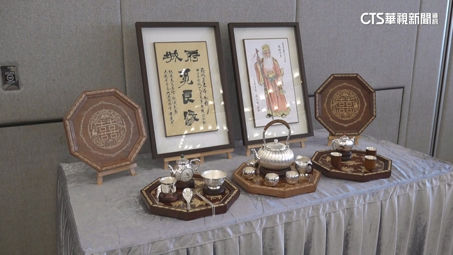 台南美展傳統工藝類首獎工藝家劉進文說:「四件就是說,由我,用茄苳入石柳的,做的喜盤,陳水林老師做的,這個銀器,潘岳雄老師的,月老的這個彩繪,還有,我們李國殿的,書法的墨寶,祝福這些,聯誼活動可以圓滿成功。」