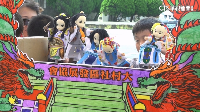 布袋戲講師馬敏華說:「偶本身就設計的蠻好的,蠻可愛的,我們就是選這個偶,來給小朋友做創作,那成功率會很高,而且每個人都有他的特色。」這些布袋戲偶全都是孩子們的創意巧思,每個角色都有不同的細節,就連故事情節以及逼真的戲台,也是師生團隊合力討論、製作而成的,這天社區也特別來到草湳定安宮廟前廣場,舉辦成果展演,也帶大家重溫廟口看戲的熱鬧回憶。