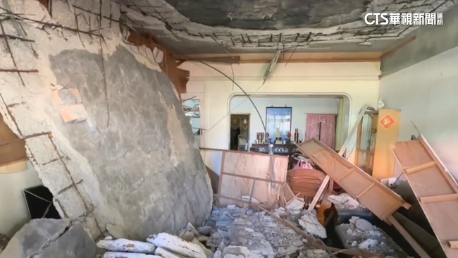 現場一片狼藉,剝落的天花板,連同裝潢一起砸下來,家具都被砸爛連人都差點被砸到,抬頭往上看,還可以看到樓板的磚造結構,{{{現場人員說:「技師來了,技師來了,3位技師這邊。」