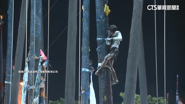 不只要往上爬,還要運用繩索,去除柱上滑溜溜的牛油,每個細節都是成敗關鍵,主持人說:「第25柱,我們之前的冠軍,石心生命禮儀公司也上柱了。」各隊伍展現團隊合作精神,在第二階段,扮演重要角色的攻旗手,使出渾身解數,往終點處攀爬,每支隊伍高度落差不大,整個活動進入緊張刺激時刻。