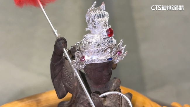 畫面上的這尊太子爺,高度只有8公分,看起來是相當威嚴又稍微可愛,頭頂戴上銀帽更加有霸氣,但神明的頭圍只有1吋半,要做這麼小頂的銀帽不只考驗功力,也要挑戰視力,最後請出工藝師郭春福來完成這個不可能的任務。