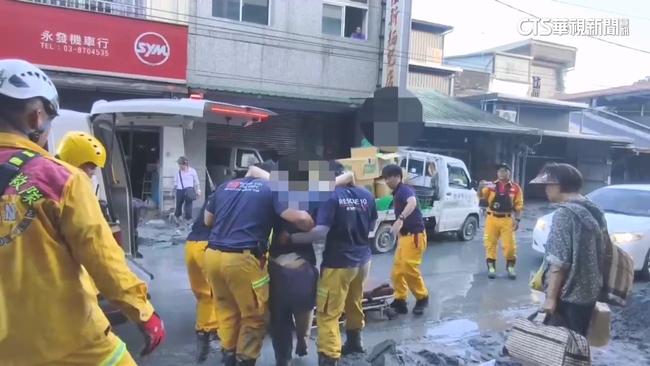 等消防救護人車抵達,再合力把他扶上擔架,這位民眾由於患有「象腿症」,行動不便,泥流灌進透天宅一樓,因此受困二樓中,直到昨(25)日下午約4點,才從中山路二段的住家內被救出,受困了約48個小時,終於重見光明,而第三批抵達花蓮救災的台南特搜隊,今(26)日上午持續任務,特搜隊員全都穿上蛙人裝,在災區搜救,因為整個區域都是泥水泥巴。