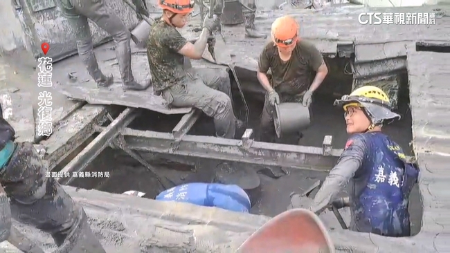 從遠方走過去,一座民房,遭厚厚泥土掩埋,只剩屋頂露出來,這裡就是花蓮光復鄉佛祖街上,6歲獲救女童小沂的住所,搜救人員鑿開屋頂,屋裡滿滿泥濘,一盆盆用畚箕,一點點挖出來來,在透過人工接力帶出去,整個過程相當艱辛。