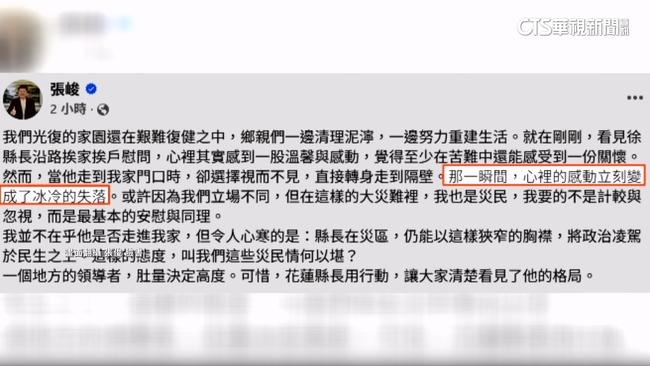 花蓮縣長徐榛蔚,前進花蓮光復災區,挨家挨戶探訪受災戶,但卻有人不太開心,花蓮縣議長張峻在臉書發文,看見徐縣長沿路慰問,心裡其實感到一股溫馨與感動,但當她走到自己門口時,卻選擇視而不見,直接轉身走到隔壁,那一瞬間心裡的感動,立刻變成了失落,花蓮縣長用行動,讓大家清楚看見了他的格局。