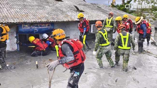儘管天氣放晴了,但挺進災區的路依舊崎嶇難行,畢竟泥水路還是很顛,搜救人員一手拉著欄杆,另一手支撐著身旁的弟兄,重災區佛祖街還是泡在泥水中,就怕有任何遺漏,搜救人員四肢趴跪在泥濘中,用手當雷達不斷探詢,搜救行動持續進行。