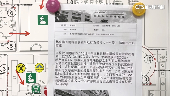 記者VS.其他學生說:「(你看到的是什麼狀況)他會拿一個那個手機放很大聲,(是什麼佛經嗎)對佛經,(有沒有跟別人聊天還是什麼),都沒有。」針對接二連三,學生遇見行為怪異婦人,甚至還疑似有學生遭到反鎖,學校才會貼出公告示警。