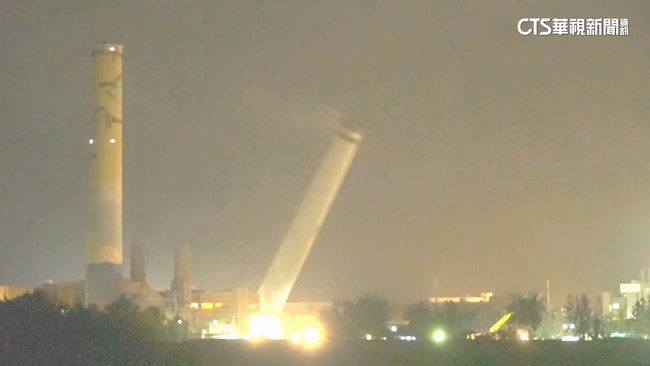 在夜色中,大煙囪逐漸傾斜,遠遠觀看的民眾,紛紛驚呼,民眾說:「會倒向這邊。」最後巨大煙囪倒向地面,揚起一片煙塵,足足有好幾層樓高,撞擊轟然巨響傳遍四周,十分震撼。昨日晚間,通霄火力發電廠5號機組煙囪,廠方以放倒的方式,讓120公尺高的煙囪倒地,當地民眾得知大煙囪要放倒,早早就來卡位觀看,小朋友也見證歷史一刻。