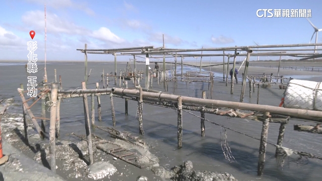 記者黃種瀛說:「雖然颱風已經過了,但是彰化王功海邊風力仍然非常強勁,我們可以看到這裡的蚵農,他們平常是會載客人來這裏採鮮蚵的,但是因為颱風把棚架給吹壞了,他們趁颱風剛過,馬上到這裡來整理棚架,因為接下來他們還得要做生意。」