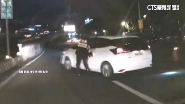 昨日晚上10點多,台北市保大警方在松江路交流道旁實施路檢,這輛租賃車違規駕駛遭盤查,潘姓員警VS.肇事駕駛說:「等一下,駕照對一下,切進來,證件對一下,你有沒有駕照,你到底在報什麼,你下來。」駕駛謊報身分,發動引擎想落跑,潘姓員警VS.肇事駕駛說:「(我報了)你幹嘛,你幹嘛。」