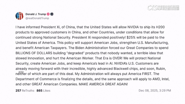 黃仁勳終於成功了!美國總統川普首度在社群發文寫下,在維持國家安全的前提下,將開放輝達H200AI晶片,出口給經核准的中國客戶,並對每筆交易收取25%利潤,輝達聞訊股價盤後上漲超過2%,輝達也針對這項議題做出回應,稱讚川普政府的決定。