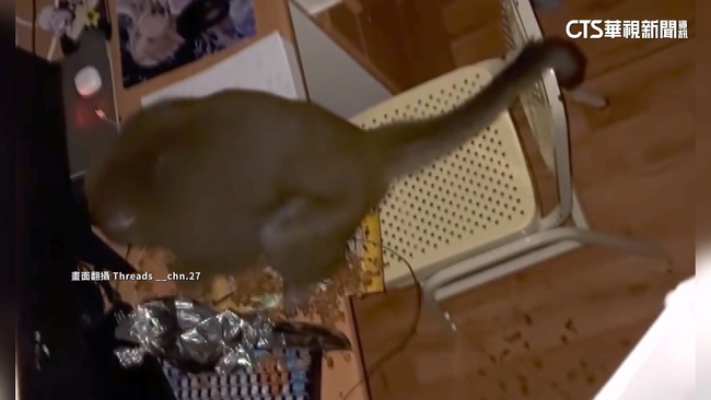 睡覺睡到一半聽到怪聲響,書桌區遭不速之客闖入,探頭一看不得了,一隻獼猴正在翻箱倒櫃,零食灑得滿地都是,扯的是牠還一把一把往嘴裡塞,而這場面不只發生一次,放眼望去宿舍宛如被洗劫過,物品散落一地,麥片全灑在地面,學生只能苦笑,因為一時疏忽忘了鎖氣窗才讓獼猴有機可乘,影片PO在網路上之後,釣出有慘痛經驗的苦主。