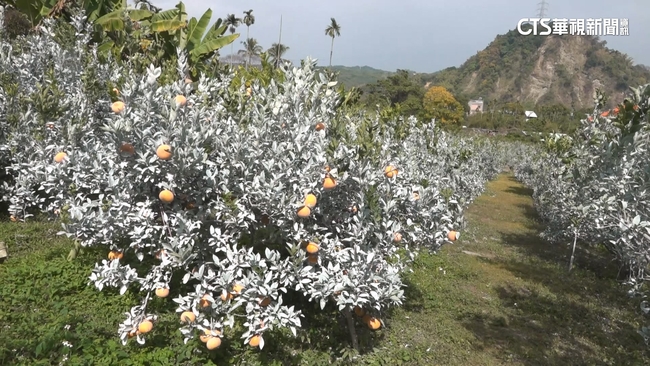 過年將近,進入茂谷柑採收期,竹山富州里茂谷柑皮薄多汁,是許多民眾過年送禮首選。這片果園呈現一片雪白景象,其實是老闆替果實噴上天然石灰粉防曬,成為產季中特別的果園美景。