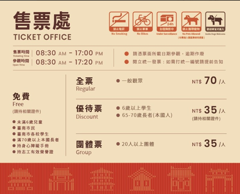 而以下身分維持「免費入場」:台南市民、6 歲以下兒童、70 歲以上長者、志工(憑志願服務榮譽證)、身心障礙者及陪同者一名、台南市各校學生。