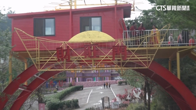 最特別的還是橫坐半空中的財神爺廟,遠遠看過就是一頂神轎的形體,不管是人還是車,從下面經過,都有鑽轎腳,財運隨行的祈福求財用意。財神爺廟創建人邱義榮說:「鳳梨是103年那時候南投燈會,他們結束以後我把它買回來的,就把我那尊神明請來,所以我們就把祂鍍金身了。」風水師陳冠宇說:「神轎的形式,鑽轎底,賺錢就賺不完。」