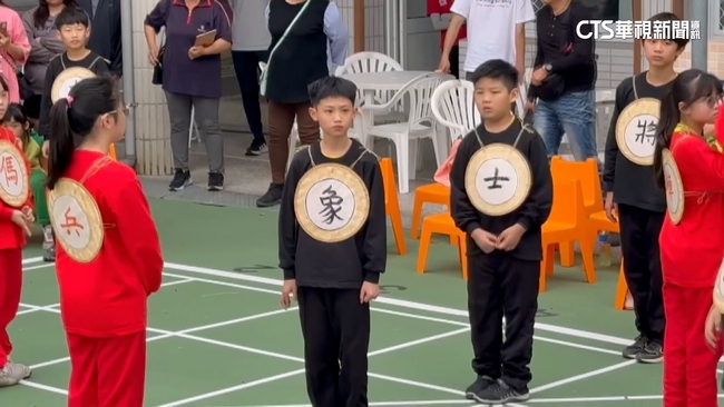地面上畫設棋盤,小朋友分成紅黑兩隊,胸前掛著象棋文字,聽從老師指令,在棋盤上依序移動,老師說:「炮二平五。」小朋友化身「真人版象棋」,有時走錯,有時和對方面對面還會忍不住偷笑,一旦被「吃掉」就要離場。