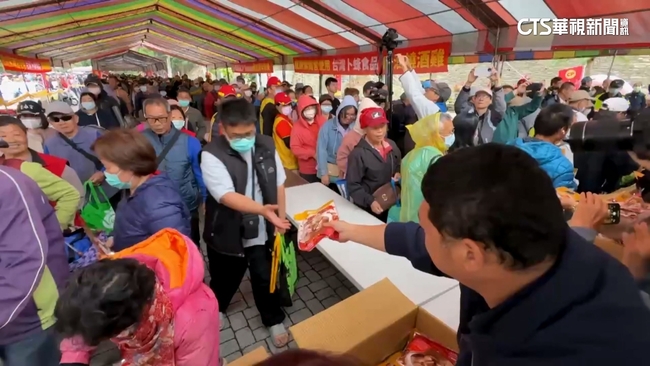 排隊民眾:「從彰化5點半出門,來到這裡六點半,排丁酒回去吃了平安順利。」領紫南宮丁酒的排隊人潮,粗步統計至少有兩萬人,廟方表示今年為了讓人人都領的到,準備了10萬份,自從疫情之後,一年一度的吃丁酒活動,改成料理包,如今疫情過去,會不會開放現場吃熱呼呼丁酒。