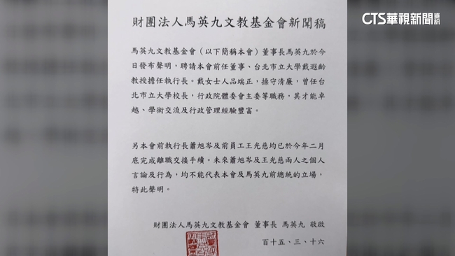 前總統馬英九總統辦公室,人事大異動,16日突然發布新聞稿,白紙黑字寫下,執行長蕭旭岑已於今年二月底,完成離職交接手續,未來言論及行為均不能代表本會及馬前總統立場,另外新聞稿也強調,接任人選戴瑕齡人品端正操守清廉。