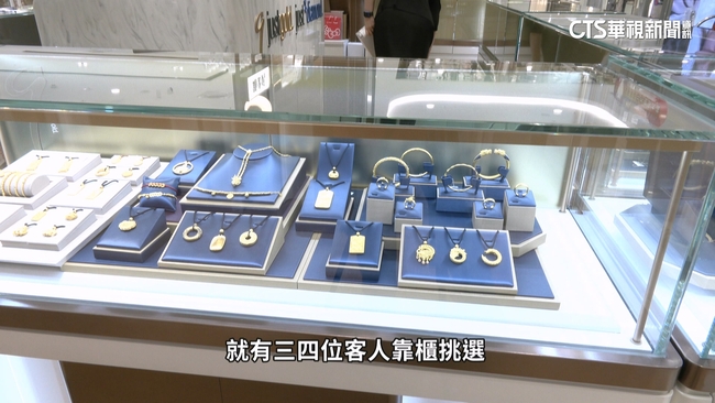 黃金手鍊帶上手,左看看右看看,百貨公司專櫃金店,各款金飾琳瑯滿目,讓人挑花了眼,實際走一趟現場發現不到一小時,就有三四位客人靠櫃挑選,金子能當飾品穿戴貴氣討吉利,而在國際情勢緊張的時刻,也是不少投資人的避險工具。