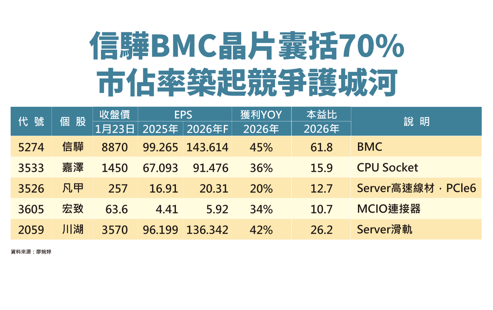 廖婉婷形容,「BMC在伺服器上有重要性,但卻沒GPU和CPU那麼重要」,所以大廠願意花時間與精力去研發GPU和CPU,對BMC的意願相對不高,加上信驊的生態系整合、市占率和產品穩定度具備優勢,使得客戶直接選擇信驊,進而形成護城河。