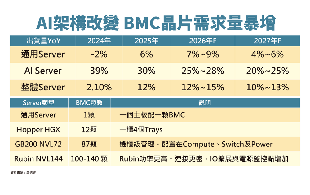 廖婉婷表示,信驊是做BMC晶片,全球市佔率高達7、8成,基本上只要是伺服器,幾乎都有信驊的參與,不過信驊過去幾年曾跌過一段時間,因為AI初期量並不多,2023年到2024年伺服器是衰退的,但是近兩年AI大好,BMC晶片需求也逐漸提升,加上AI進階到推理的階段,Rubin的BMC顆數激增到100至140顆,這也是為何外資估2027年信驊EPS有機會到200元以上的原因。