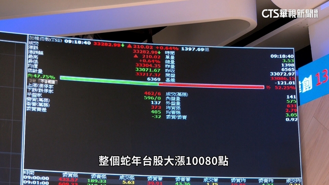 台股金蛇年封關日,一片喜氣洋洋,證交所更邀請羽球天后戴資穎,擔任年度人物,一起見證台股創新高的歷史時刻,台股封關日大漲532.74點,收在33605點新高紀錄,整個蛇年台股大漲一萬零八十點,而股市焦點台積電,創下1915元封關新高價,台積電在蛇年總計上漲780元,漲幅68.7%,市值增加超過新台幣20兆,貢獻大盤約6262點。