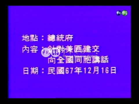 「親愛的父老、兄弟、姊妹們,今天大家心頭都非常沉重。美匪決定,進一步的勾搭,建立所謂外交關係的消息,各位都已經知道了。對於這件不幸的事情,政府為了維護中美人民的長期友誼和兩國間的共同利益,曾在過去幾年間,盡一切努力,守責(忍辱)負重地予以勸阻。