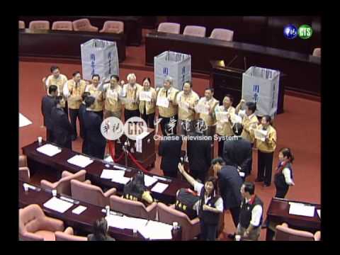 票還沒投,國、親兩黨立委先用聲勢壓人。喊完口號後,一個個乖乖排隊領票。監票人是國民黨的郭素春和親民黨的柯淑敏,雙雙不敢大意,嚴密監控。由於採記名投票,無所謂,反正票就是大剌剌地亮出來給大家看;相較於台聯,國、親感覺略遜一籌,因為台聯的票不是用蓋章的方式,而是直接用紅筆寫上「棄權」兩個字表達立場。