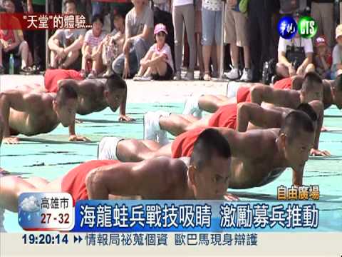 國防部全面推動募兵制,成效卻不佳,擔心兵員不足。下午在自由廣場前,由海龍蛙兵等不同軍種展現戰技表演,現場還讓民眾體驗兩棲蛙人最辛苦的天堂路,希望鼓吹大家參與募兵。