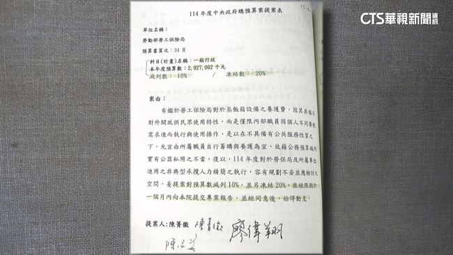攤開勞保局「歲出計畫」,其實不只蒸飯箱,還包括電梯、空調、飲水機等等,養護費108萬6千元,另外第34項,差不多的項目,但是名目為「汰換設備費」181萬,陳京輝認為項目重複,恐怕是「個人使用」,認為有刪減必要。