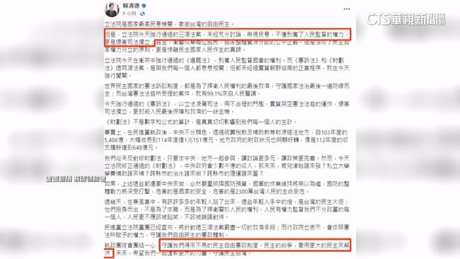 總統賴清德21日凌晨,也在臉書發文,立法院今天強行通過的三項法案,未經充分討論、無視民意,不僅剝奪了人民監督的權力,更是侵害司法獨立,並直言民主的紛爭要用更大的民主來解決,接下來針對三項修法。