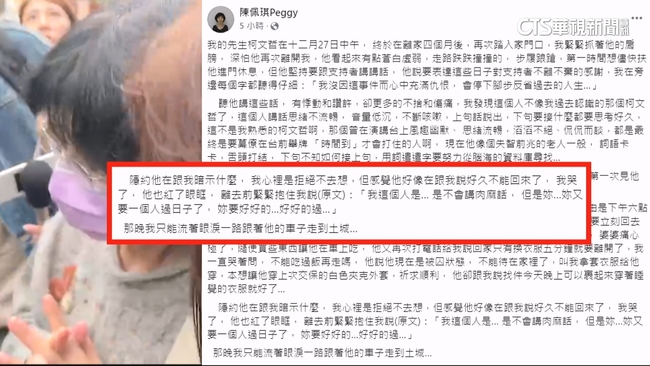 民眾黨前主席柯文哲再度被收押,至今已經一週,他的妻子陳佩琪在臉書發文透露,柯文哲交保時看起來有點蒼白虛弱,不僅走路跌跌撞撞,連講話思緒也不流暢,就像失智前兆的老人一般。甚至寫下柯文哲要去開庭前,紅著眼眶緊抱住她,要她好好的過。字字句句,難掩離情依依。