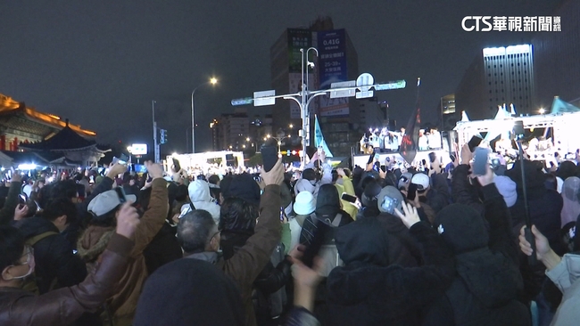 亮起手機燈海,全場大合唱柯文哲應援曲,代理主席黃國昌,率領黨公職上戰車喊話小草,民眾黨遊行一路到傍晚,即便宣布散場,支持者還是不願離去,黃國昌號召從自由廣場,轉往愛國西路口集結,警方也立刻部署上百名警力,用人牆進行管制,好在沒衝突順利落幕。