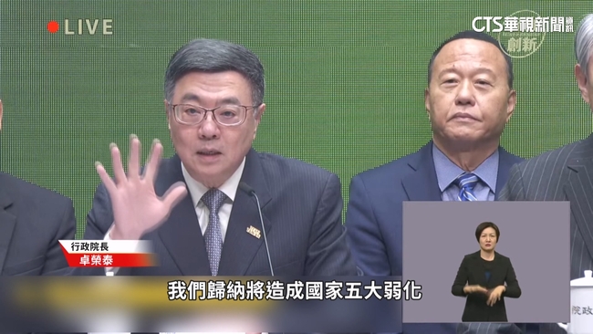 而民眾黨團提案,總計減列約2061億元凍結約974億元,大約占整體中央政府總預算10%。朝野坐下來談,同時行政院也有動作,行政院長卓榮泰:「通三案歸納五大弱化。」行政院長卓榮泰率領各部會官員,在行政院會後記者會上,闡述若預算被刪影響甚鉅。