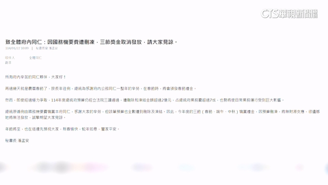 總統府內部信件曝光,由總統府祕書長潘孟安發出,收件人寫著全體同仁,內容寫下,總統原循例由國務機要費犒賞總統府員工,但該筆預算也全數遭到刪除及凍結。因此,今年度的三節(春節、端午、中秋)犒賞禮金,因預算刪凍,將無財源支應,很遺憾將無法發放,誠摯期望大家見諒。