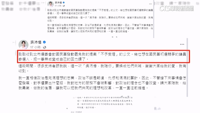 吳沛憶在臉書秀出中選會公文,明確寫下2月5日收受罷免案,不予受理,回嗆罷免團隊名稱的一事無成,成了自己的回力鏢。罷免雙吳總召集人滿志剛說:「我們要跟吳沛憶委員道歉,讓您失望了,因為罷免案會繼續,我們一開始為了雙保險,我們就有送兩隊進去。」