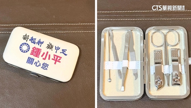 指甲修容組,完整七件套翻到背面,印上候選人鍾小平大名,還有競選標語,鍾小平上節目時證實這組修容組,來自立院黨團總召傅崐萁贈送。主持人王偊菁VS.台北市議員(國)鍾小平說:「(是跟傅崐萁批貨嗎?)沒有跟我收錢啊,送我的,(送幾組?)一萬吧,(傅崐萁)助理打給我嘛,說要送東西來,我也是老江湖,這個多少錢,30塊以上就不行,他說20幾塊。」