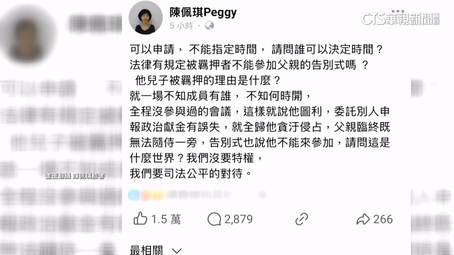 前民眾黨主席柯文哲父親柯承發,將於3月10日舉辦告別式,但柯文哲卻因京華城案,仍關押在土城看守所中。柯家頻頻喊話,希望能讓柯文哲回家送爸爸最後一程,妻子陳佩琪臉書甚至質疑,法律有規定被羈押者不能參加父親的告別式嗎?面對質疑,台北看守所指出,目前尚未收到申請。