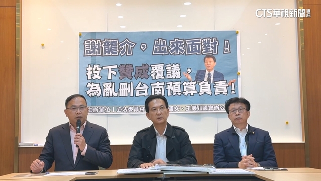 為台南市長選戰加溫,民進黨立委林俊憲今(7)日召集,黨內同樣出身台南的立委開記者會,抨擊國民黨團大砍總預算,矛頭更對準立委謝龍介,質疑在總預算表決時,對凍結「南科管理局預算」30%投下贊成票,恐怕會耽誤溪北發展,對此,謝龍介在臉書開直播回擊林俊憲沒有江湖道義,更不忘提一句初選對手陳亭妃遭到恐嚇的爭議,隔空較勁。