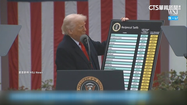 美國總統川普說:「64%,我們會(向台灣)收取32%關稅。」關稅政策從台灣時間9日中午12點01分開始生效,從川普手拿的表格來看,課稅課得最高的是非洲國家賴索托,和北美洲群島國家並列第一,其他亞洲國家柬埔寨寮國越南,都被課徵百分之45以上的關稅,至於中國對等關稅34%,我國和印尼32%排行第19,不過中國若加上本來的20%,總共被課徵54%關稅,形同隱形榜首。