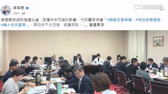 行政院長卓榮泰也在臉書貼出照片,強調行政團隊持續積極全面準備,希望有效控管風險,並擴大支持產業,這兩天不分日夜、密集研討,相關作為,記者會上都會一併向國人來說明。