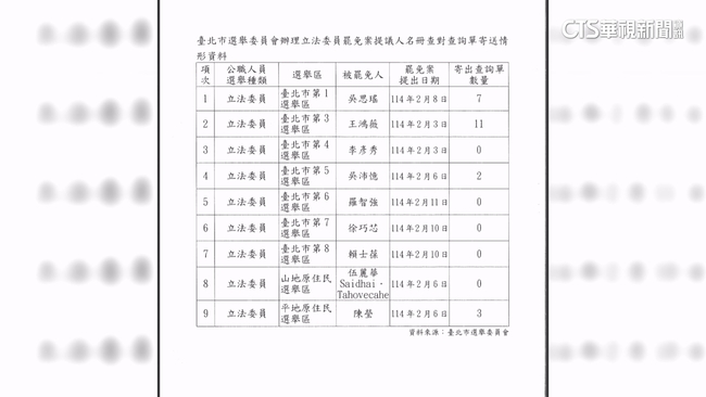 簡舒培拿出數據來佐證,光是台北市遭到罷免的藍綠委加起來,就有9個人,在北市選委會一共寄出23張查詢單中,其中民進黨立委吳思瑤不合格率34.4%,死亡連署86份查詢單只有7張,吳沛憶不合格率更飆破四成查詢單僅僅2張,另外原住民立委陳瑩3張,反觀國民黨立委王鴻薇,不合格率4.5%,死亡連署0份,查詢單卻多達11張。