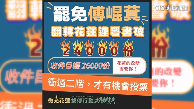 大罷免第二階段連署持續進行,罷免國民黨立委傅崐萁民團,也宣布突破法定門檻,為求二階順利達標,民團也呼籲民眾出來連署,甚至上修安全門檻,至於傅崐萁暫時沒有回應。