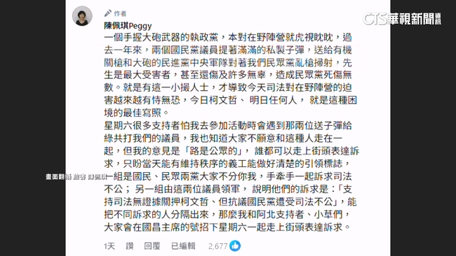 台北市長蔣萬安致詞時,台下民眾高喊「游淑慧下台」,而游淑慧穿著卡其色外套,對比其他人穿著白色,也顯得有些違和,但支持者的不滿,從陳佩琪的貼文中可能有得依循,日前她痛批,有兩位國民黨議員,提著私製子彈送給綠營中央掃射民眾黨,陳佩琪最後也沒出席大遊行,倒是再次隔空發文替先生柯文哲喊冤。